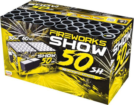 - Bateria 50 strzałów. Kaliber 30mm. Czas 60 sec. Dolot 40m. Posiada Certyfikat CE F2.